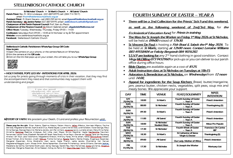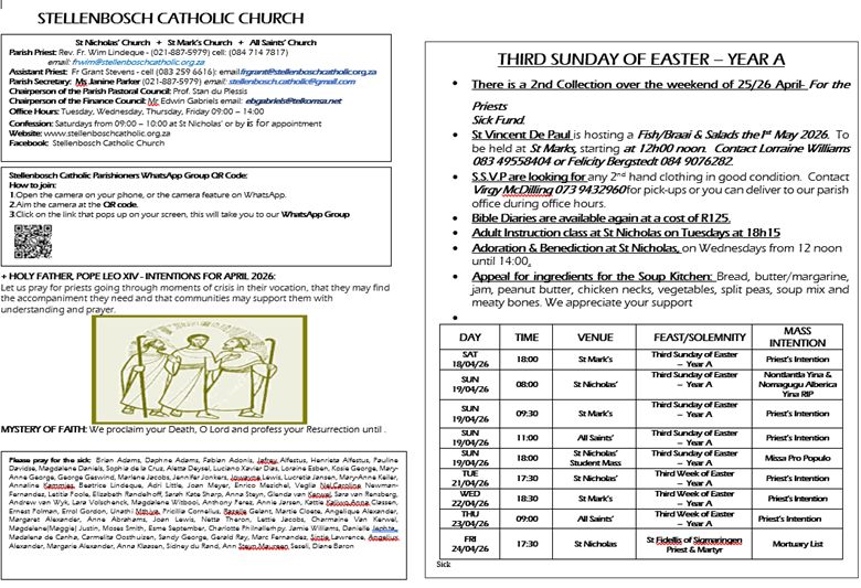 The Stellenbosch Catholic Church consists of 3 churches (St Nicholas’, St Mark’s and All Saints’) and five communities (St Nicholas’, St Mark’s, All Saints’, Kayamandi and the student community), rich in diversity of language, culture, age and economic circumstances.